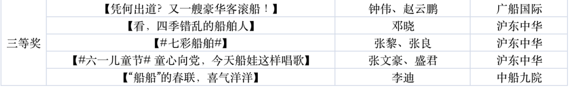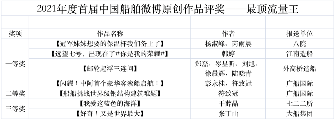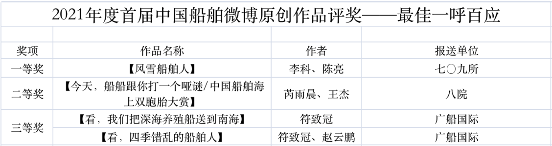 為鼓勵(lì)更多成員單位積極加入到中國船舶集團(tuán)新媒體平臺(tái)的宣傳中來,在集團(tuán)公司黨群工作部的指導(dǎo)下,中國船舶報(bào)社從不同維度,對(duì)2021年度各單位支持“中國船舶”微信的力度進(jìn)行了梳理統(tǒng)計(jì),并利用微博政務(wù)的全國專家?guī)煸u(píng)審資源,對(duì)2021年度“中國船舶”微博原創(chuàng)作品進(jìn)行了專業(yè)評(píng)審,評(píng)選結(jié)果公布如下: