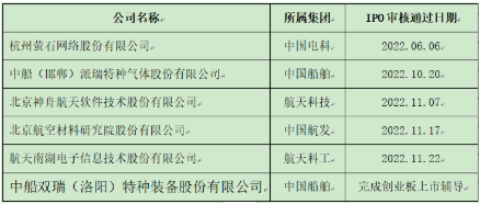 2022年的資本市場,行情不熱行業(yè)熱。從已經(jīng)公開披露的信息看,2022年中央企業(yè)專精特新小巨人在科創(chuàng)板和創(chuàng)業(yè)板持續(xù)發(fā)力,目前已有中無人機(航空工業(yè))、國博電子(中國電科)、振華風(fēng)光(中國電子)、昆船智能等7家企業(yè)IPO上市。此外,截至2022年11月30日,已有多家央企專精特新企業(yè)IPO申請通過了科創(chuàng)板上市委審核和創(chuàng)業(yè)板上市輔導(dǎo),其中有兩家中國船舶集團旗下企業(yè)(見下表)。這些企業(yè)將在2023年IPO上市,主要來自船舶、航空、航天和軍工電子行業(yè)。