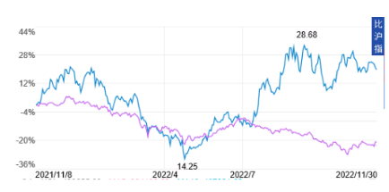 很顯然,中船系憑其創(chuàng)新和產(chǎn)業(yè)鏈優(yōu)勢已成為中國資本市場一股新生力量。中國船舶集團龍頭股中國船舶(600150)2022年11月30日收盤價比去年同期上漲約20%,跑贏大市。下圖為2022年11月30日中國船舶與滬深300指數(shù)漲跌對比圖,上部曲線為中國船舶,下部曲線為滬深300。
