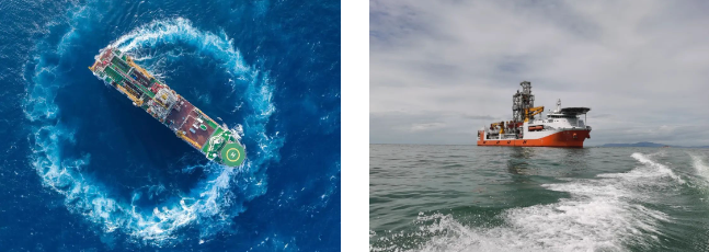 #  通過配置最先進(jìn)的DP-3級動力定位系統(tǒng),自動調(diào)整船舶底部7臺推進(jìn)器的轉(zhuǎn)向和推力大小,來抵抗海上風(fēng)、浪、流作用在船上的載荷,使船舶在海上保持一定的水平位置;