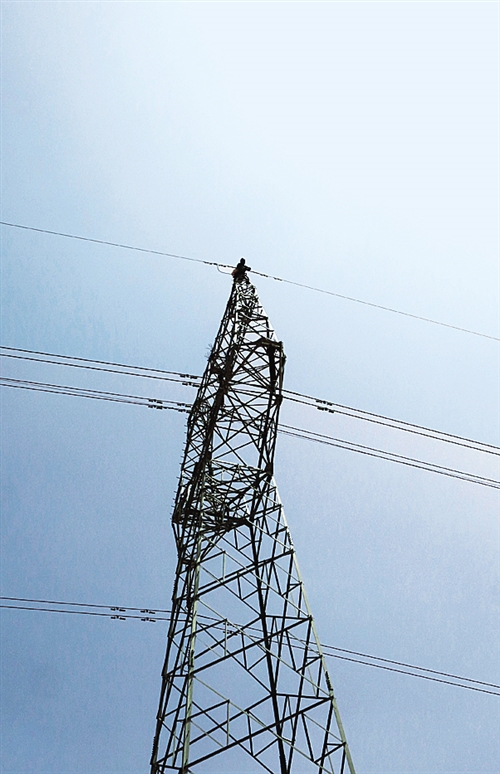 一名電工爬上一座電網(wǎng)塔基進行檢修。這條331公里的輸電線路是新疆東南部且末縣和若羌縣10萬多居民用電的主要憑借。