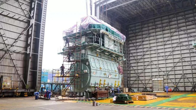 1號船塢里,4層樓高的主機吊裝完成