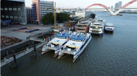 2020年12月30日,中國船舶集團(tuán)旗下遠(yuǎn)舟公司所屬英輝南方造船(廣州番禺)有限公司建造的“新海韻”號、“新海駿”號兩艘鋁合金雙體高速客船,同時在廣州市番禺區(qū)英輝南方碼頭順利交付。“新海韻”、“新海駿”是英輝南方為船東建造的藍(lán)色干線系列高速客船的第8和第9艘,船長42.8米,寬10.3米,載客199人,設(shè)計航速35節(jié)。遠(yuǎn)舟公司所屬英輝南方在鋁合金高速客船第三代船型基礎(chǔ)上,開展技術(shù)創(chuàng)新和船型優(yōu)化,開發(fā)完成了“新海韻”、“新海駿”為代表的第四代新船型。