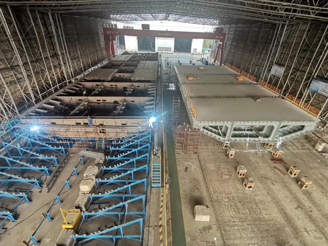 同樣承擔(dān)了深中通道隧道沉管鋼殼制造任務(wù)的中國(guó)船舶集團(tuán)旗下廣船國(guó)際,近日剛剛完成了E15管節(jié)鋼殼的過(guò)駁交付。E16鋼殼計(jì)劃在9月底前進(jìn)行聯(lián)合驗(yàn)收;E17鋼殼則正在進(jìn)行大節(jié)段總組。
