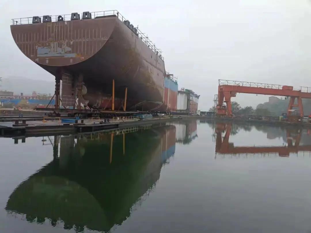 該公司在建的8000噸不銹鋼化學品船1號船艉總段拖移到位。