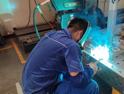 武漢船機——鋼構制造部員工穿著厚厚的防護服進行焊接工作。
