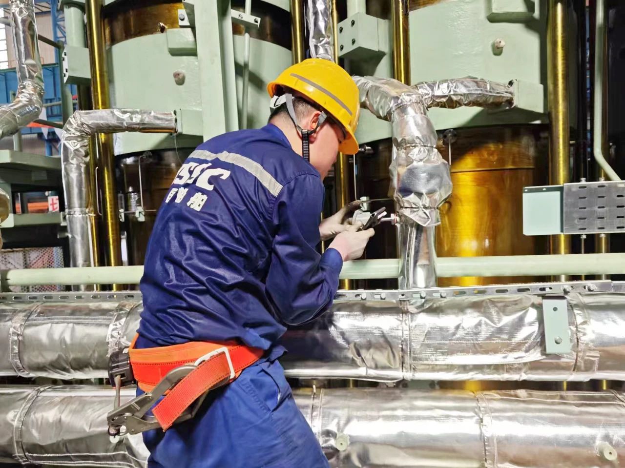 中船發動機——調試人員頂著高溫在認真安裝傳感器,汗水濕透了衣裳。