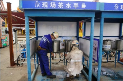 江南造船為一線員工送棒冰、鹽汽水、酸梅湯、水壺等物資,食堂開設綠豆湯專供窗口,生產區域設置115個大麥茶供應點,遍布各車間、碼頭、休息區;提前策劃,按就近、共享以及區域化管理原則,新增職工小家,開放辦公樓宇和食堂,設置高溫休息點。