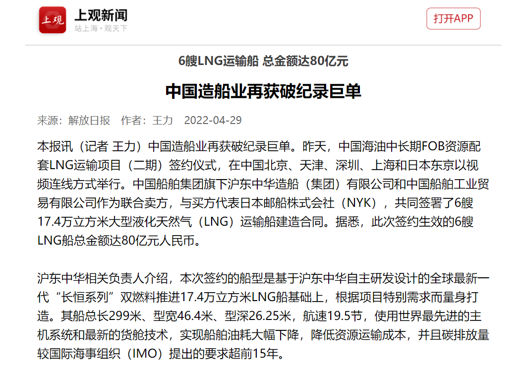 4月28日,中國(guó)海油中長(zhǎng)期FOB資源配套LNG運(yùn)輸項(xiàng)目(二期)簽約儀式,在中國(guó)北京、天津、深圳、上海和日本東京以視頻連線方式成功舉行。中國(guó)船舶集團(tuán)有限公司旗下滬東中華和中船貿(mào)易作為聯(lián)合賣方,與買方代表日本郵船株式會(huì)社(NYK),共同簽署6艘17.4萬(wàn)立方米大型液化天然氣(LNG)運(yùn)輸船建造合同。